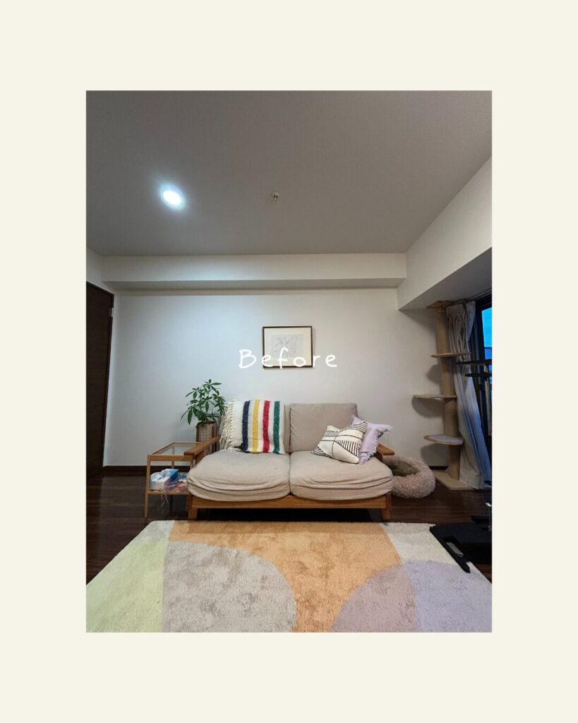 大きなオフホワイトのラグをご提案しました。 面積の広い床の露出を減らすことで、大がかりなDIYをしなくてもお部屋の印象が劇的に和らぎます。