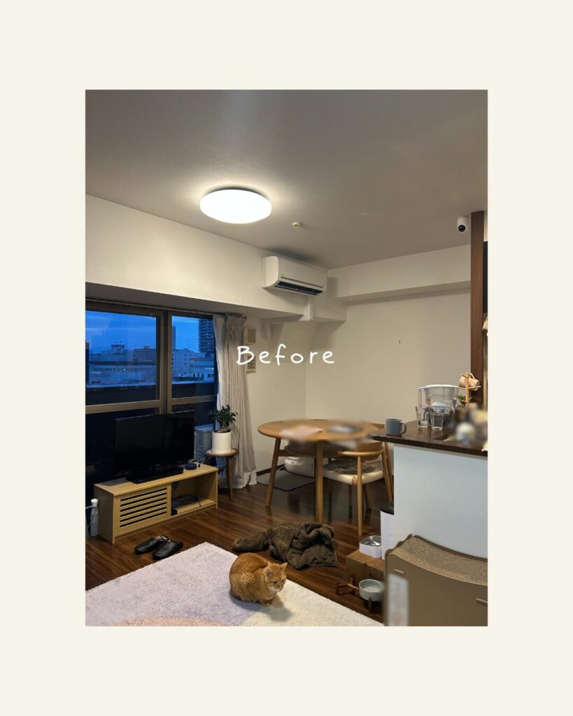 「お部屋が殺風景で、色味や質感の統一が難しい」とお悩みだったYさん。愛猫ちゃんと一緒に暮らしながら、程よく生活感があり、温かみのある空間を作りたいというご要望をいただきました