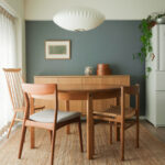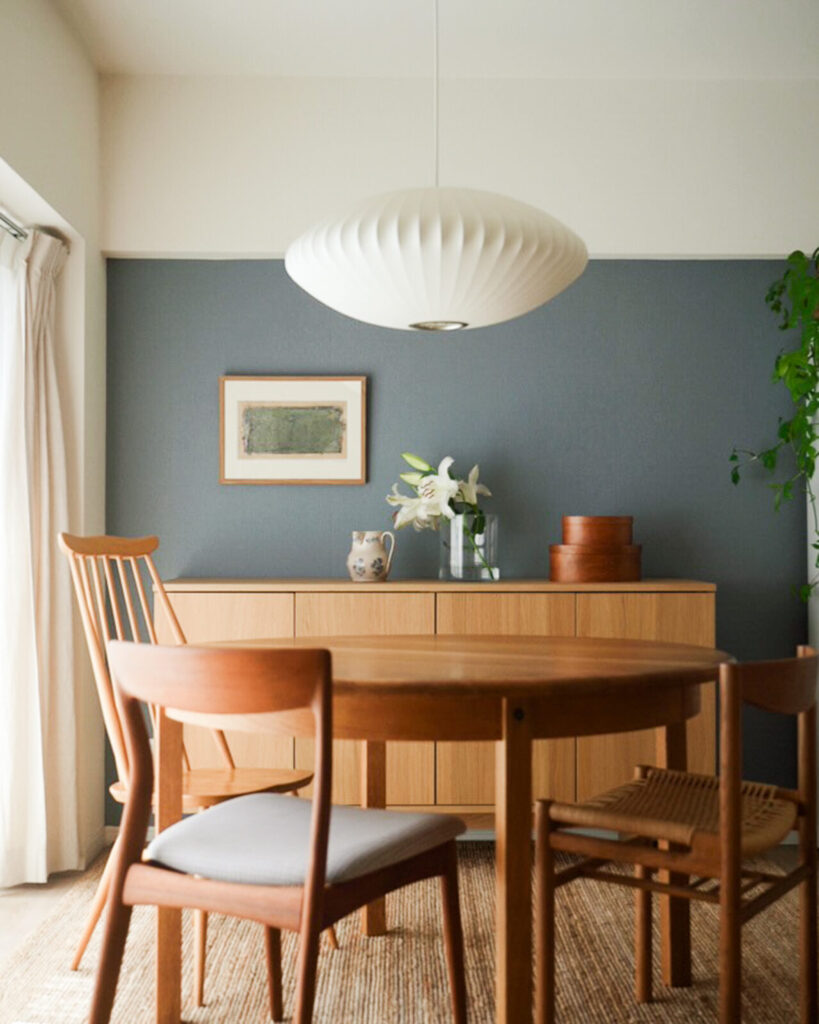 サイドボードの明るいオークカラーに対し、床まで明るく揃えすぎると、どこか浮ついた印象になりがち。ジュートのラフな質感が、空間に深みと落ち着きを与えてくれました。