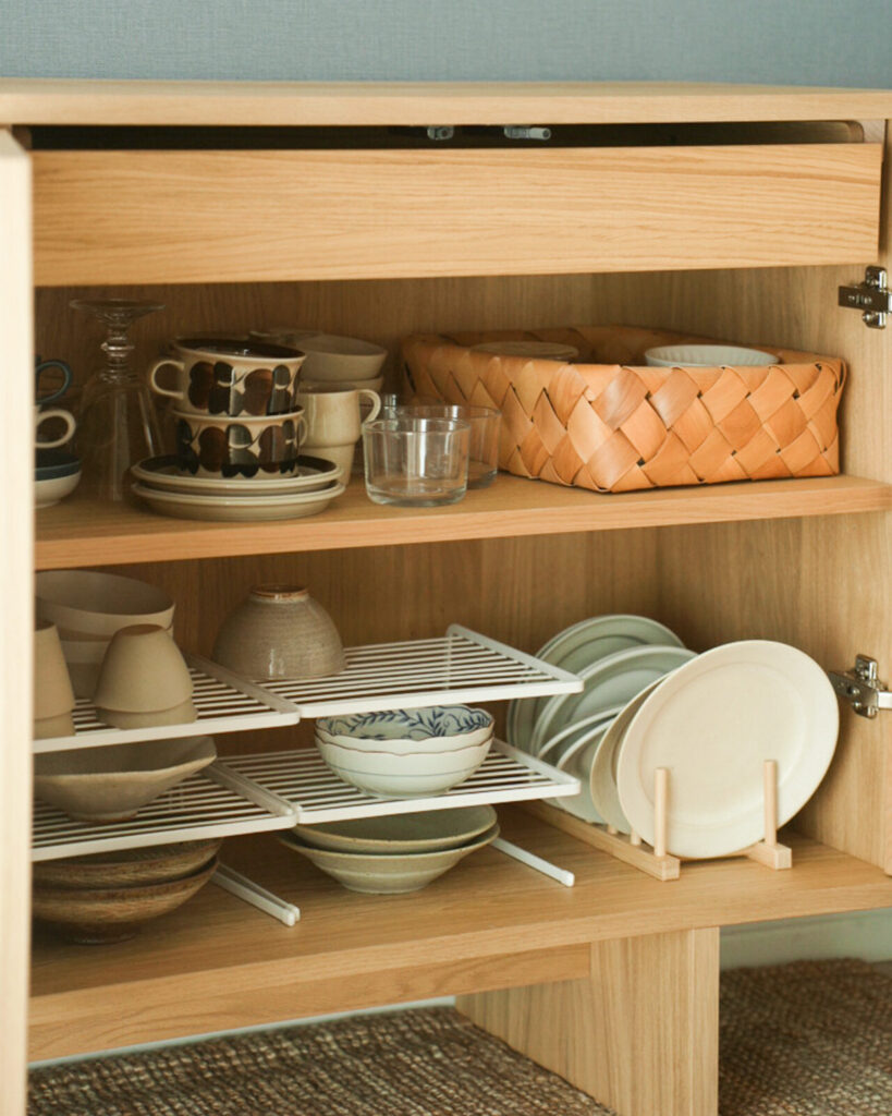 扉は取っ手のないプッシュ式。動作はスムーズですが、高級家具のような吸い付くような滑らかさはありません。日常使いの道具として割り切れば、十分に満足できる使い心地です。