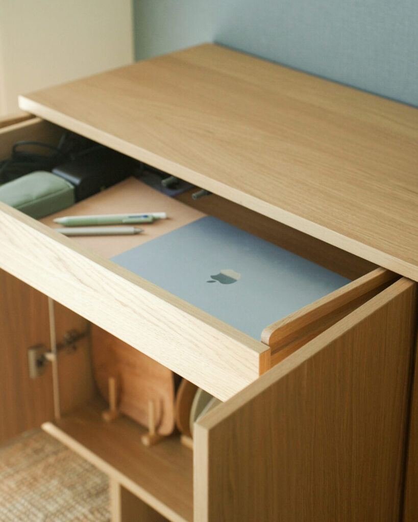 - 正直に言えば、至近距離で見たり触れたりすると、チープさを感じる箇所もあります。しかし、引き出しを外に出さないミニマルな設計や、表面の木目の美しさは見事。全体のバランスを整えれば、十分にお値段以上の存在感を放ってくれます。
