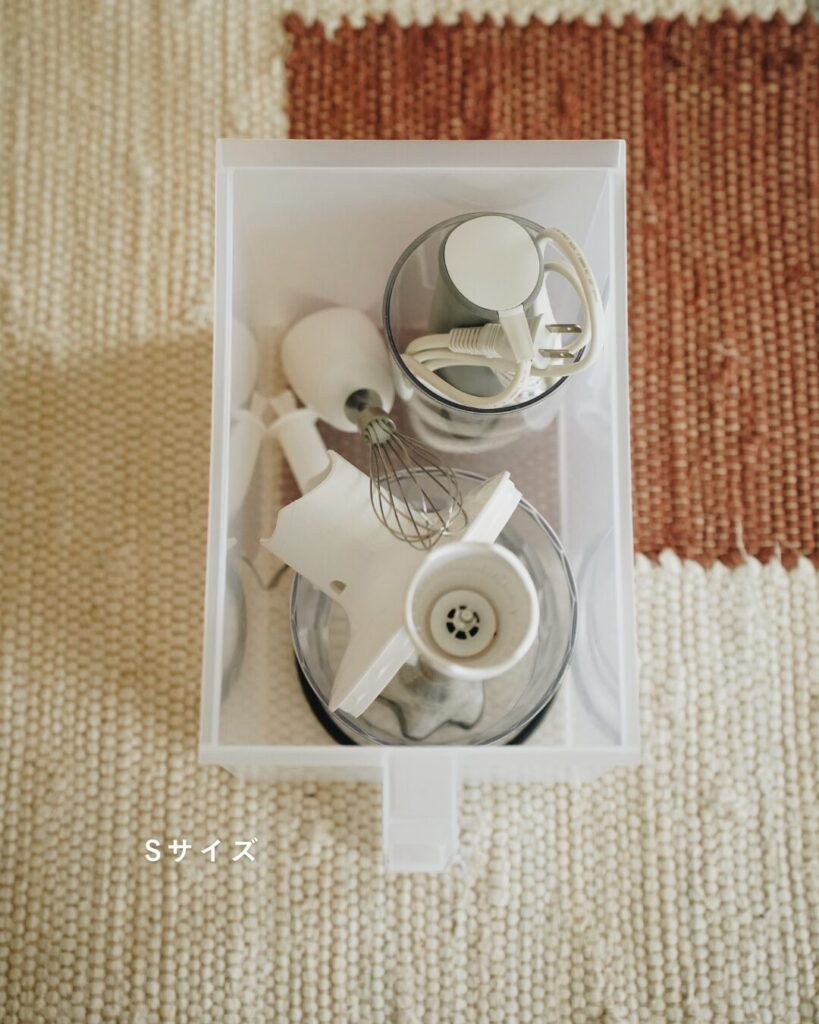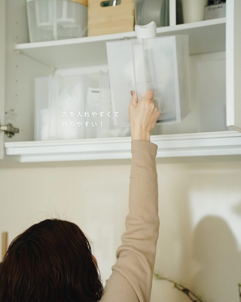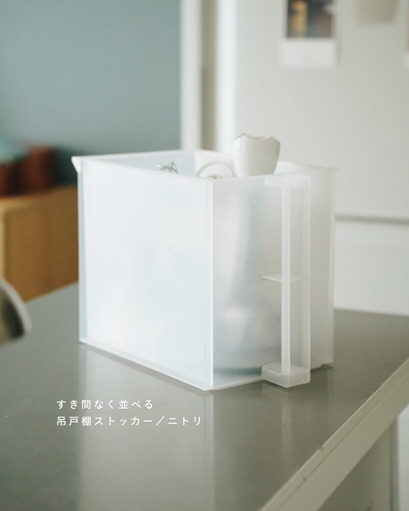 吊戸棚には、ガシッと掴める大きな持ち手付きのニトリのBOXを。以前は無印のPPケースを使っていましたが、指一本をかけるタイプは重いものだと結構つらくて。
